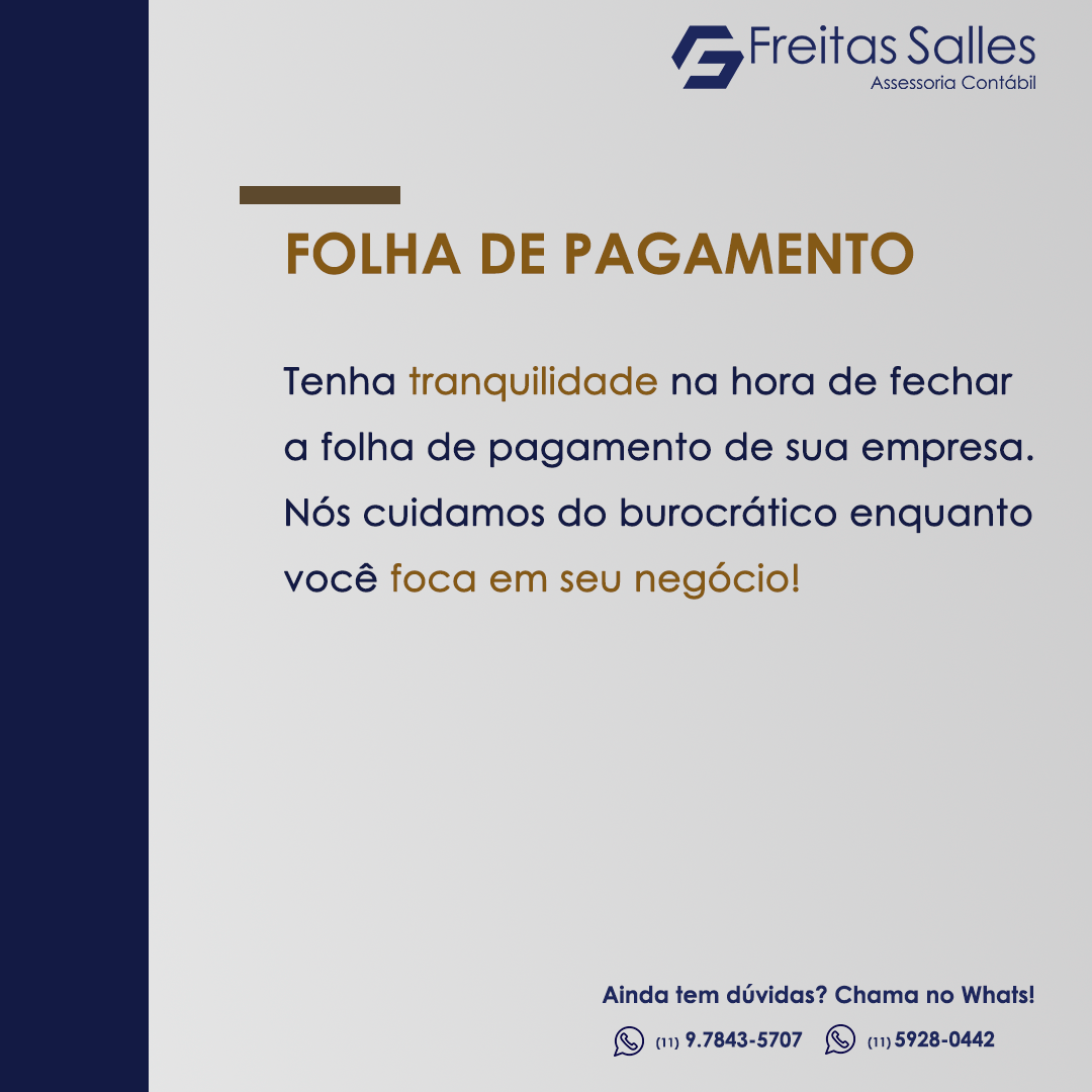 Precisa de ajuda com a contabilidade da folha de pagamento da sua empresa? Entre em contato com Freitas Salles Contábil e descubra como podemos simplificar sua gestão e potencializar seus resultados!